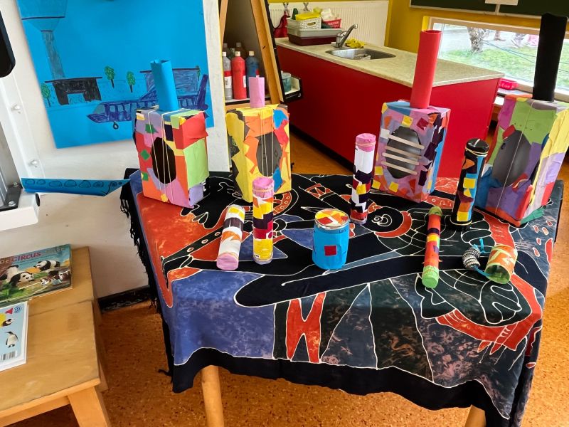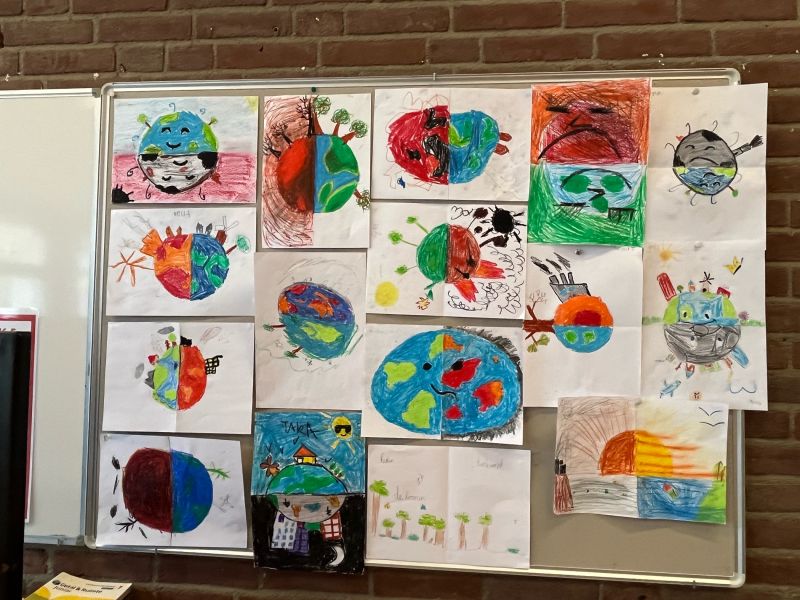 Op de tentoonstelling waren alle producties te bewonderen: verhalen, tekeningen, muziekinstrumenten, creatieve uitvoeringen, informatiegidsen en natuurlijk de themamuur die in elke klas het proces van het project mooi liet zien.